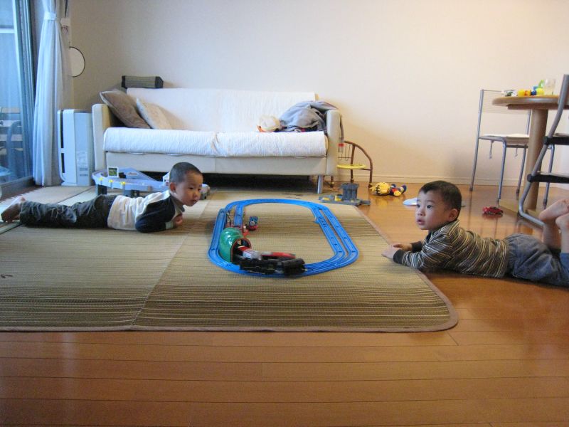お友達のおうちでは共通の大好物プラレールで遊びました。