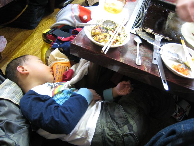 私と荷物とテーブルのわずかな隙間で熟睡の息子↑↑