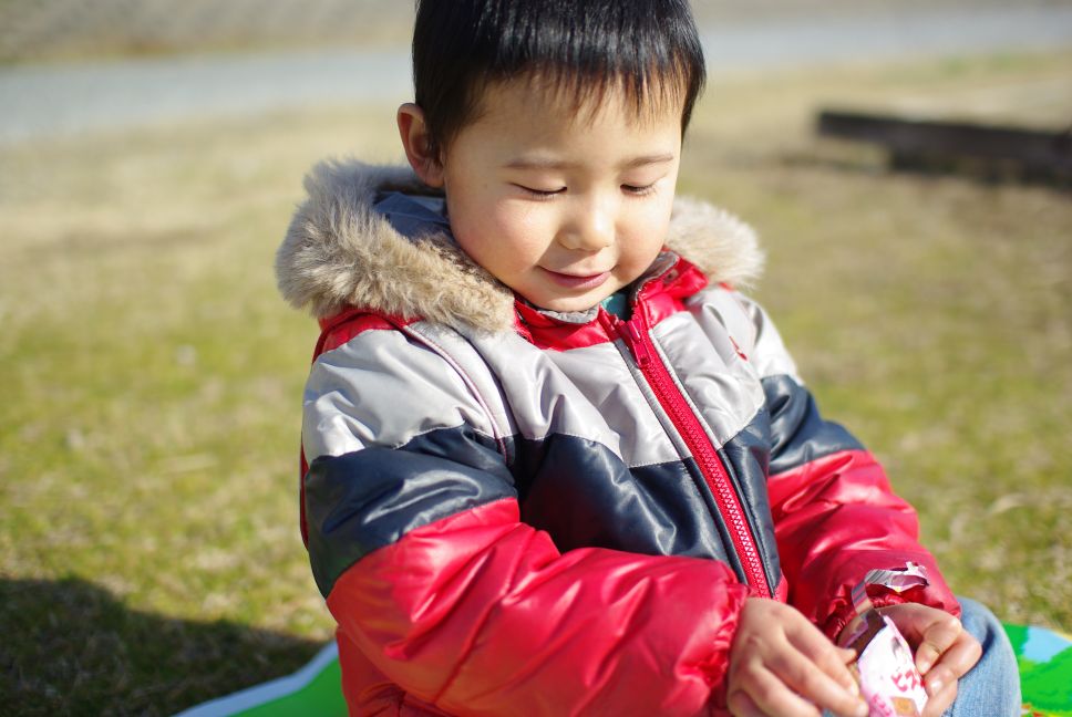 今日はおやつを外で食べよう♪ということになり、この寒い中お出かけです。