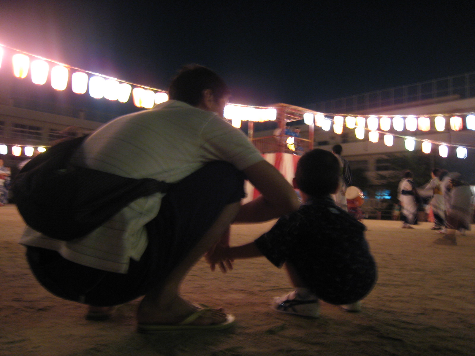 昨年、私の実家の夏祭りでは太鼓のそばをウロウロしたり、中央でひとり小躍りしたりと積極的だったのに、ちょっと恥ずかしいということを知り始めたのでしょうか。輪の外で見守っています。