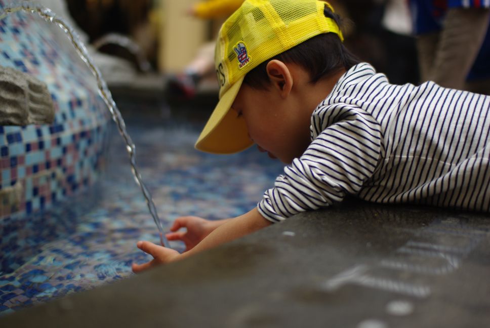 早速、買ったばかりのキャップをかぶり噴水で遊ぶ息子↑↑