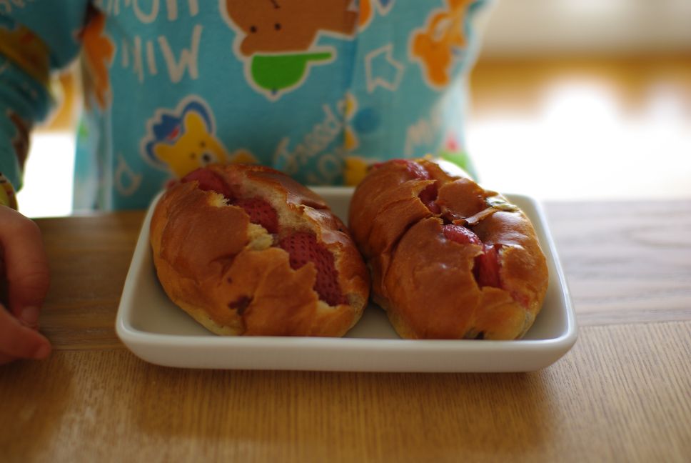 この日は息子はパジャマのままではないし、パンもナイフでキレイにカットしてあります^^;