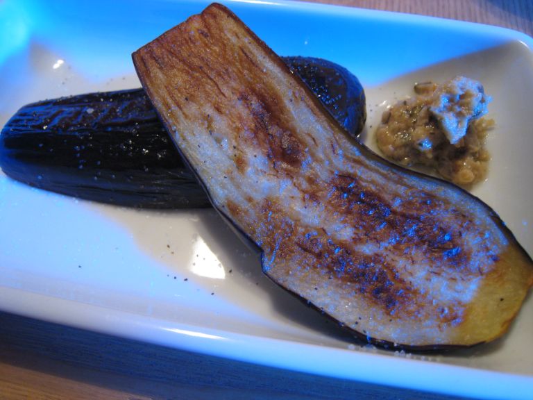 焼きナスに軽く塩コショウして、ズッキーニのペーストを添えました。