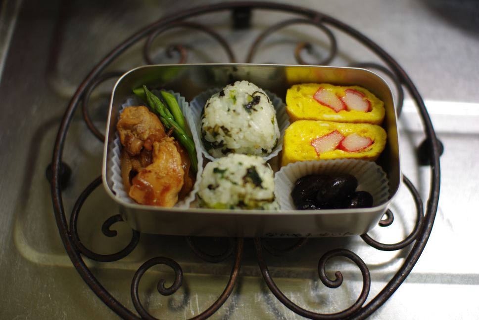 ふりかけおにぎり・照り焼きチキン・グリーンアスパラ・カニカマ入り卵焼き・黒豆