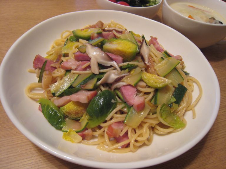 具材はズッキーニとベーコン、そして芽キャベツ。