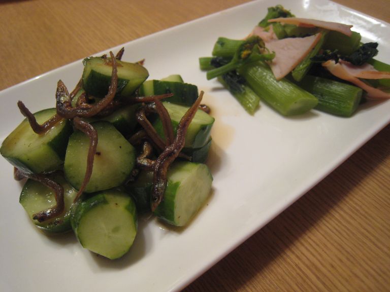 隣のものは、アスパラ菜とハムを蒸して塩コショウとレモン汁で調えたもの。
