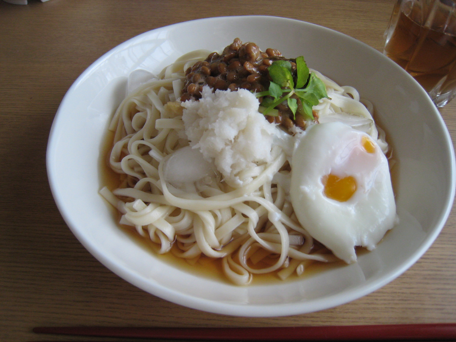 冷たいうどんの上に納豆、納豆昆布、大根おろし、クレソン、半熟たまごをのせて。