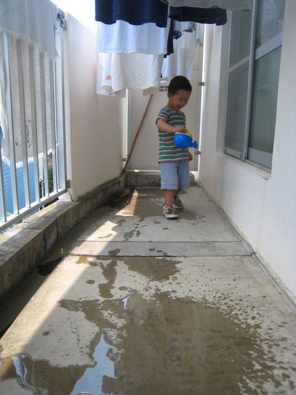 それに刺激され、我が家でもベランダにて今年初めての打ち水だ!!