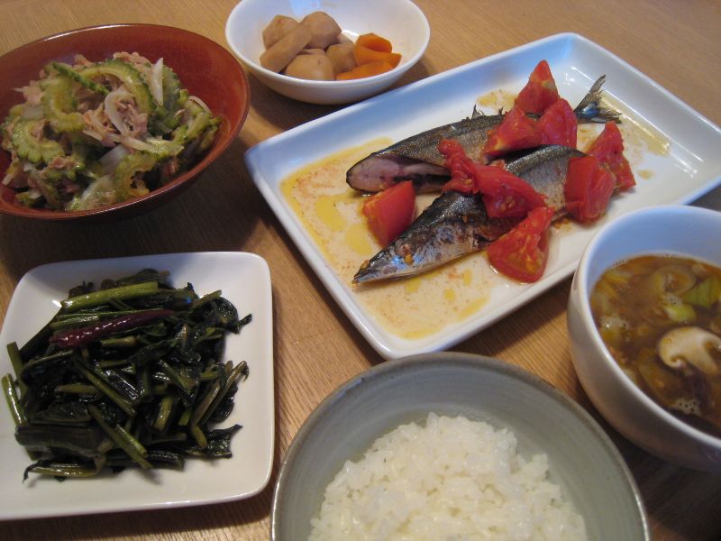 サンマをトマトと一緒にオリーブオイルで焼きました。